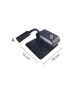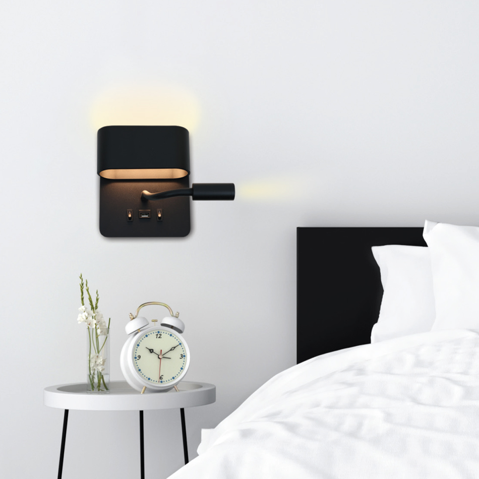 Πρόκειται για ένα μεταλλικό μαύρο επιτοίχιο φωτιστικό. Στο μπροστινό του μέρος υπάρχουν δύο διακριτικά διακόπτει ώστε οι δύο πηγές φωτισμού να μπορούν να ανάβουν ανεξάρτητα. Και οι δύο φωτισμοί είναι led θερμής απόχρωσης. Αυτό που ενισχύει την ιδιαιτερότητά του είναι η θύρα usb που είναι ενσωματωμένη και δίνει τη δυνατότητα φόρτισης του κινητού τηλεφώνου!