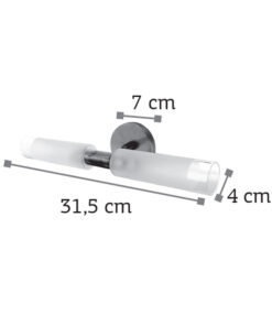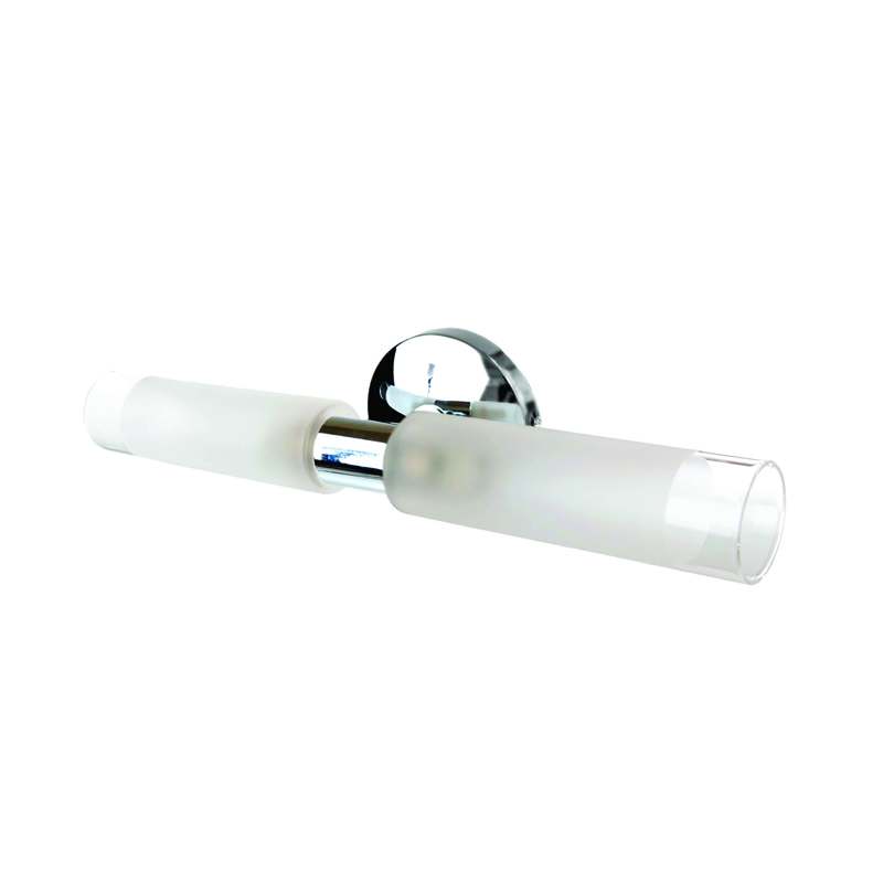 Πρόκειται για ένα επιτοίχιο φωτιστικό κατασκευασμένο από μέταλλο σε χρώμιο απόχρωση με δύο λαμπτήρες που καλύπτονται από κυλινδρικό γυαλί αμμοβολής με διάφανες λεπτομέρειες. Είναι η ιδανική επιλογή για φωτισμό μπάνιου τοποθετημένο πάνω από τον καθρέπτη αφού το φως διαχέεται ομοιόμορφα.