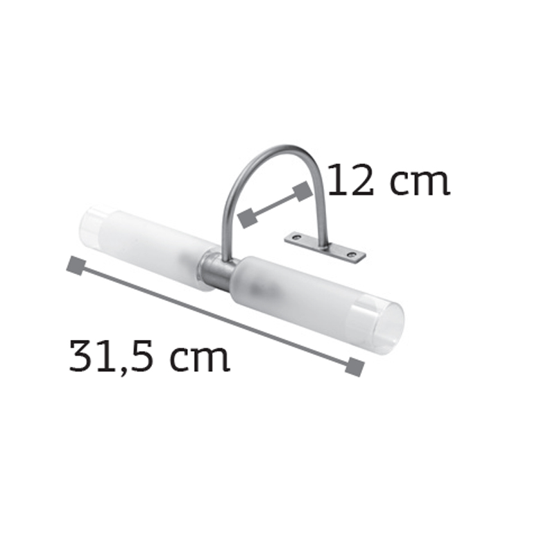 Πρόκειται για ένα επιτοίχιο φωτιστικό κατασκευασμένο από μέταλλο σε χρώμιο απόχρωση με δύο λαμπτήρες που καλύπτονται από κυλινδρικό γυαλί αμμοβολής με διάφανες λεπτομέρειες. Είναι η ιδανική επιλογή για φωτισμό μπάνιου τοποθετημένο πάνω από τον καθρέπτη και όταν υπάρχει έλλειψη χώρου για την βάση του. Το φως διαχέεται ομοιόμορφα.