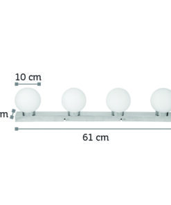 Πρόκειται για ένα επιτοίχιο φωτιστικό από χρώμιο μέταλλο λευκή οπαλίνα και τέσσερις λαμπτήρες. Η μίνιμαλ σχεδίαση και το σχήμα του το τοποθετεί σε μοντέρνους χώρους εσωτερικής διακόσμησης. Τοποθετείται και ως φωτιστικό οροφής!
