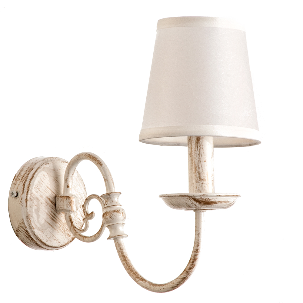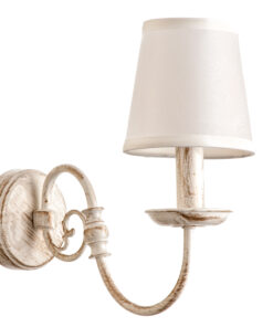 Πρόκειται για ένα επιτοίχιο φωτιστικό από μέταλλο σε λευκή πατίνα με έναν λαμπτήρα. Κατάλληλο για διακόσμηση κλασσικών εσωτερικών χώρων. Διατίθεται και λευκό υφασμάτινο καπέλο για πιο απαλό φωτισμό το οποίο θα πρέπει να ζητηθεί επιπλέον.