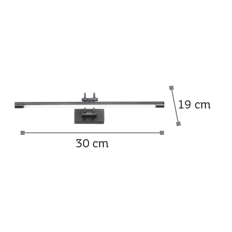 Πρόκειται για ένα μαύρο μεταλλικό επιτοίχιο φωτιστικό με κινούμενο το μπροστινό μέρος. Το λευκό ακρυλικό καλύπτει τον led φωτισμό θερμής απόχρωσης.