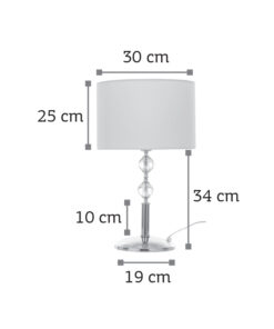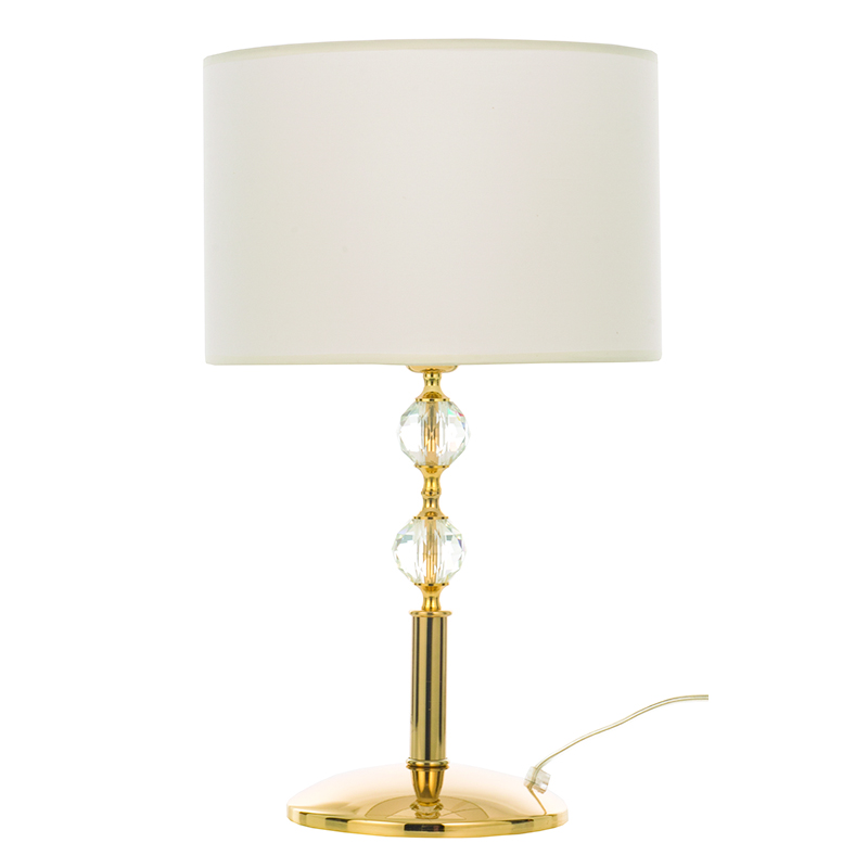 Πρόκειται για ένα χρυσό μεταλλικό επιτραπέζιο φωτιστικό με λευκό υφασμάτινο καπέλο. Τη λιτή του σχεδίαση συμπληρώνουν οι δύο διάφανοι κρύσταλλοι που του δίνουν μια επιπλέον λάμψη.