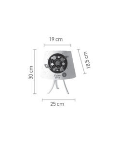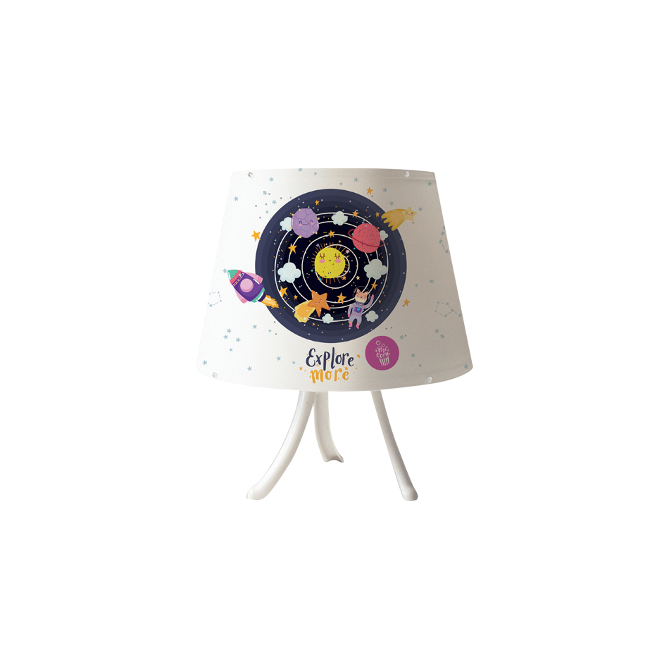 Πρόκειται για ένα επιτραπέζιο παιδικό φωτιστικό από μέταλλο σε λευκή απόχρωση με πολύχρωμο καπέλο.