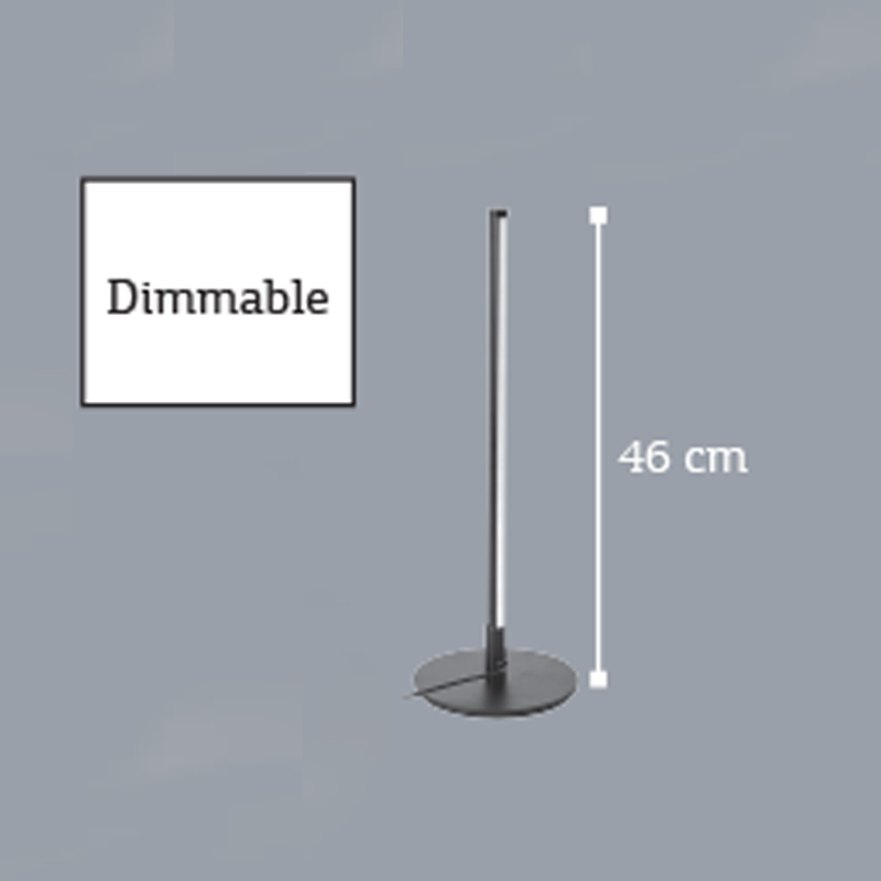 Πρόκειται για ένα γραμμικό επιτραπέζιο φωτιστικό από μαύρο μέταλλο. Το λευκό ακρυλικό καλύπτει τον led φωτισμό θερμής απόδοσης.