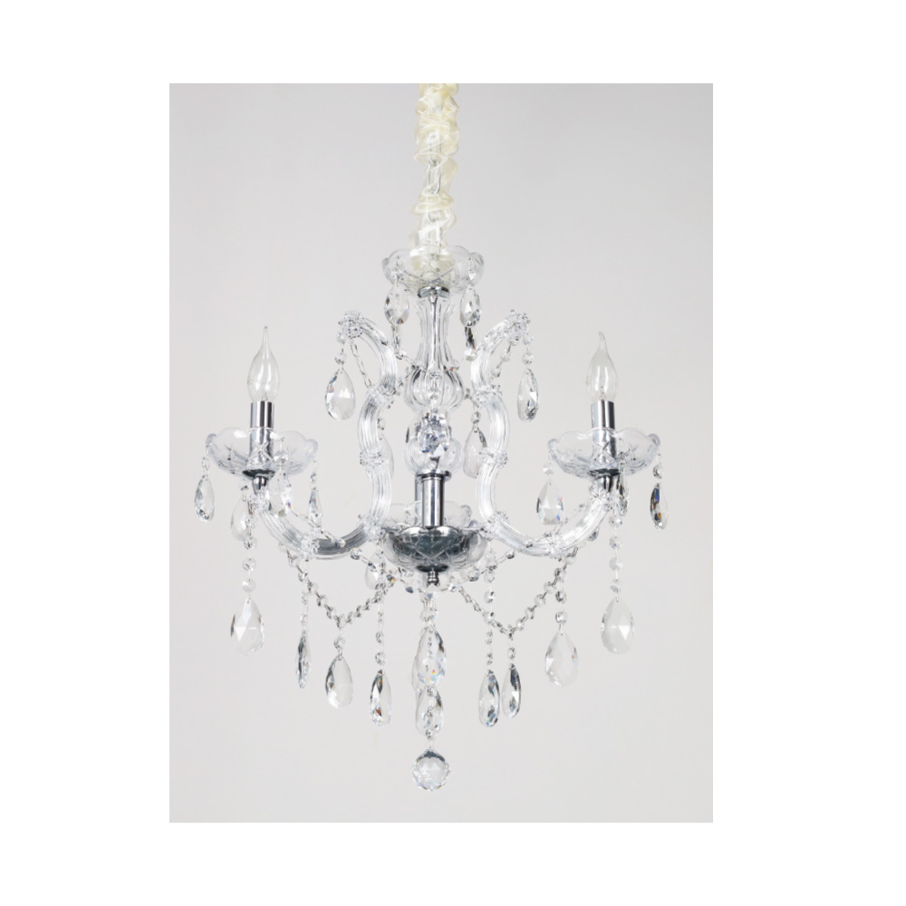Πρόκειται για ένα κρεμαστό φωτιστικό με τρείς λαμπτήρες. Το σώμα του αποτελείται από χρώμιο μέταλλο που καλύπτεται από διάφανο γυαλί. Τα κρύσταλλα που το διακοσμούν είναι διάφανα. Η μεταλλική ανάρτηση είναι ρυθμιζόμενη ώστε να προσαρμόζεται στον κάθε χώρο. Διατίθεται και η επιλογή του υφασμάτινου καπέλου το οποίο πρέπει να ζητηθεί επιπλέον.