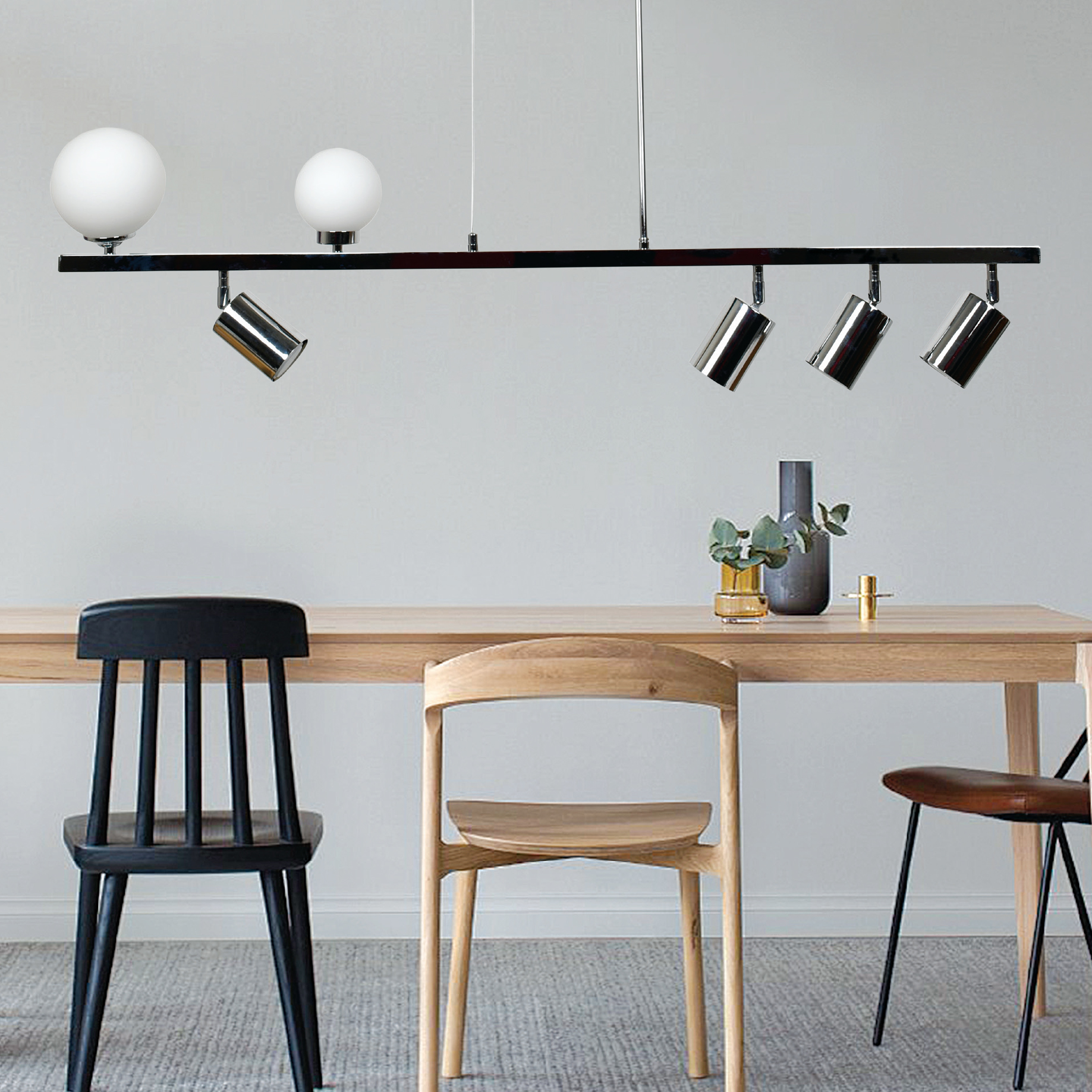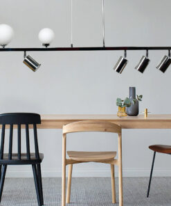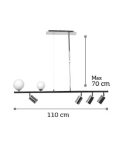 Πρόκειται για ένα κρεμαστό χρώμιο μεταλλικό φωτιστικό. Ο φωτισμός του είναι συνδυαστικός, αποτελούμενος από δύο λαμπτήρες διάχυσης καλυπτόμενους από λευκή οπαλίνα και τέσσερις λαμπτήρες πιο εστιακούς καλυπτόμενους από μεταλλικό καπάκι. Η ανάρτηση είναι ρυθμιζόμενη ώστε να προσαρμοστεί στον χώρο τοποθέτησής του.
