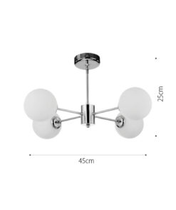 Πρόκειται για ένα χρώμιο μεταλλικό φωτιστικό με λευκή οπαλίνα στο τελείωμα και τέσσερεις λαμπτήρες. Η μίνιμαλ σχεδίασή του το τοποθετεί ιδανικά σε οποιονδήποτε μοντέρνο εσωτερικό χώρο.