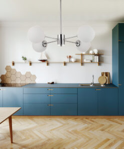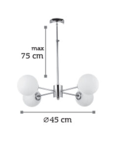 Πρόκειται για ένα χρώμιο μεταλλικό φωτιστικό με λευκή οπαλίνα στο τελείωμα και τέσσερις λαμπτήρες. Η μίνιμαλ σχεδίασή του το τοποθετεί ιδανικά σε οποιονδήποτε μοντέρνο εσωτερικό χώρο. Η ανάρτησή του είναι μεταλλική και ρυθμιζόμενη ώστε να προσαρμοστεί ιδανικά στον χώρο τοποθέτησής του.