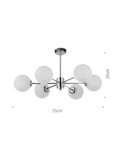 Πρόκειται για ένα χρώμιο μεταλλικό φωτιστικό με λευκή οπαλίνα στο τελείωμα και έξι λαμπτήρες. Η μίνιμαλ σχεδίασή του το τοποθετεί ιδανικά σε οποιονδήποτε μοντέρνο εσωτερικό χώρο.
