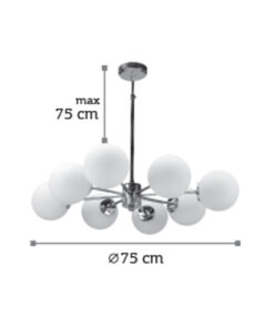 Πρόκειται για ένα χρώμιο μεταλλικό φωτιστικό με λευκή οπαλίνα στο τελείωμα και οχτώ λαμπτήρες. Η μίνιμαλ σχεδίασή του το τοποθετεί ιδανικά σε οποιονδήποτε μοντέρνο εσωτερικό χώρο. Η ανάρτησή του είναι μεταλλική και ρυθμιζόμενη ώστε να προσαρμοστεί ιδανικά στον χώρο τοποθέτησής του.
