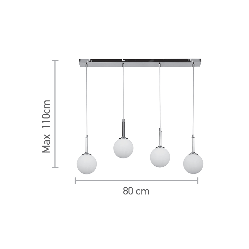 Πρόκειται για ένα χρυσαφί μεταλλικό φωτιστικό με λευκή οπαλίνα και τέσσερις λαμπτήρες. Το ύψος μπορεί να ρυθμιστεί ώστε να προσαρμοστεί στον μοντέρνο χώρο τοποθέτησής του.