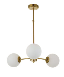 Πρόκειται για ένα χρυσό ματ μεταλλικό φωτιστικό με λευκή οπαλίνα στο τελείωμα και τρεις λαμπτήρες. Η μίνιμαλ σχεδίασή του το τοποθετεί ιδανικά σε οποιονδήποτε μοντέρνο αλλά και πιο κλασσικό εσωτερικό χώρο. Η ανάρτησή του είναι μεταλλική και ρυθμιζόμενη ώστε να προσαρμοστεί ιδανικά στον χώρο τοποθέτησής του.