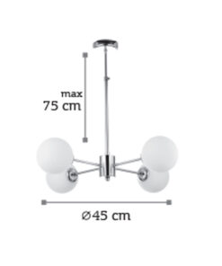 Πρόκειται για ένα χρυσό ματ μεταλλικό φωτιστικό με λευκή οπαλίνα στο τελείωμα και τέσσερις λαμπτήρες. Η μίνιμαλ σχεδίασή του το τοποθετεί ιδανικά σε οποιονδήποτε μοντέρνο αλλά και πιο κλασσικό εσωτερικό χώρο. Η ανάρτησή του είναι μεταλλική και ρυθμιζόμενη ώστε να προσαρμοστεί ιδανικά στον χώρο τοποθέτησής του.