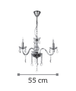 Πρόκειται για ένα διάφανο γυάλινο κρεμαστό φωτιστικό με τρεις λαμπτήρες. Τόσο τα διάφανα κρύσταλλα που κρέμονται όσο και οι χρώμιο μεταλλικές λεπτομέρειες του προσδίδουν μια επιπλέον λάμψη. Η χρώμιο μεταλλική ανάρτηση είναι ρυθμιζόμενη και προσαρμόζεται στον κάθε χώρο.