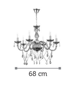 Πρόκειται για ένα φιμέ γυάλινο κρεμαστό φωτιστικό με έξι λαμπτήρες. Τόσο τα φιμέ κρύσταλλα που κρέμονται όσο και οι χρώμιο μεταλλικές λεπτομέρειες του προσδίδουν μια επιπλέον λάμψη. Η χρώμιο μεταλλική ανάρτηση είναι ρυθμιζόμενη και προσαρμόζεται στον κάθε χώρο.
