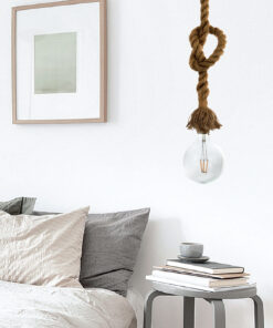 Μονόφωτο κρεμαστό φωτιστικό κατασκευασμένο από σχοινί και μεταλλική μαύρη λεπτομέρεια στην οροφή. Το ύψος του μπορεί να ρυθμιστεί είτε κόβοντάς το σχοινί, είτε πλέκοντάς το δημιουργώντας επιπλέον κόμπο!