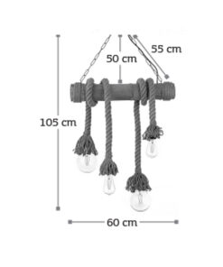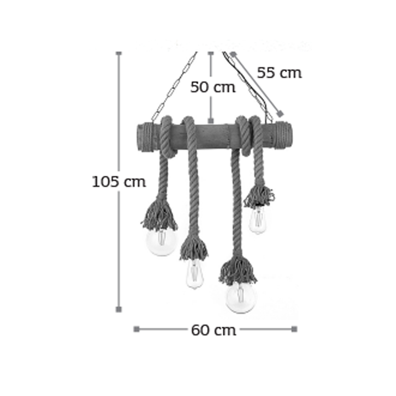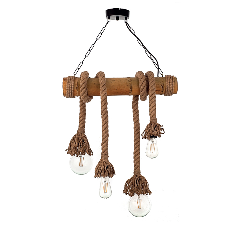 Πρόκειται για ένα φωτιστικό οροφής με τέσσερις λαμπτήρες που συνδυάζει καφέ σχοινί, μπαμπού και μαύρη μεταλλική ανάρτηση. Κατάλληλο για εσωτερικούς χώρους και τοποθετείται ιδανικά πάνω από τραπεζαρία λόγω του σχήματός του. Ο φωτισμός του εξαρτάται από τον λαμπτήρα που θα επιλεχθεί.