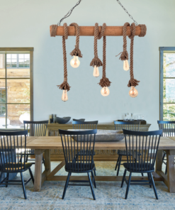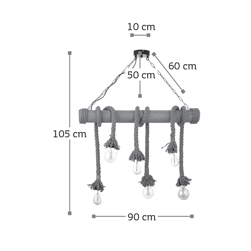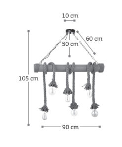 Πρόκειται για ένα φωτιστικό οροφής με έξι λαμπτήρες που συνδυάζει καφέ σχοινί, μπαμπού και μαύρη μεταλλική ανάρτηση. Κατάλληλο για εσωτερικούς χώρους και τοποθετείται ιδανικά πάνω από τραπεζαρία λόγω του σχήματός του. Ο φωτισμός του εξαρτάται από τον λαμπτήρα που θα επιλεχθεί.