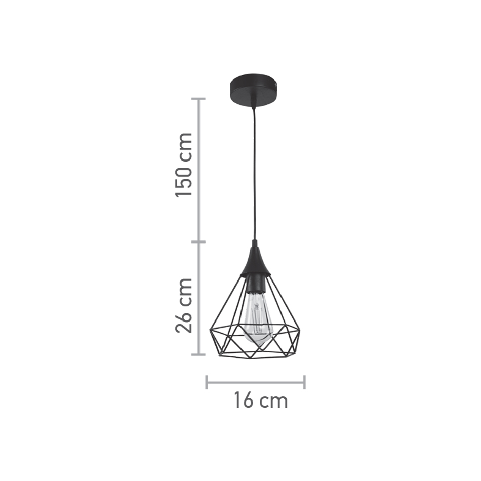 Πρόκειται για ένα μεταλλικό κρεμαστό φωτιστικό σε χρώμα μαύρο. Η μίνιμαλ σχεδίασή του το τοποθετεί σε οποιονδήποτε μοντέρνο εσωτερικό χώρο. Η ανάρτησή του ρυθμίζεται για να λάβει το επιθυμητό ύψος. Το φως διαχέεται σε όλον τον χώρο ομοιόμορφα.