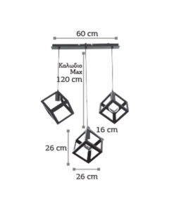 Πρόκειται για ένα μεταλλικό κρεμαστό φωτιστικό σε χρώμα μαύρο. Η μίνιμαλ γεωμετρική του σχεδίαση το τοποθετεί σε οποιονδήποτε μοντέρνο εσωτερικό χώρο. Η ανάρτησή του ρυθμίζεται για να λάβει το επιθυμητό ύψος. Το φως διαχέεται σε όλον τον χώρο ομοιόμορφα.