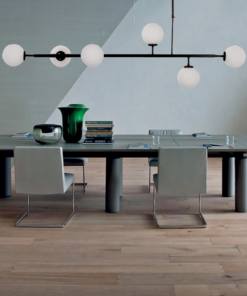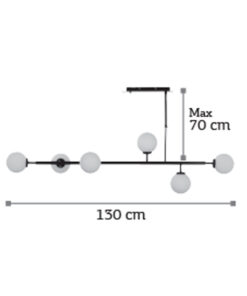 Πρόκειται για ένα μαύρο μεταλλικό κρεμαστό φωτιστικό με λευκή οπαλίνα και έξι λαμπτήρες. Τοποθετείται ιδανικά πάνω από τετράγωνα και ορθογώνια τραπέζια, ώστε να επιτευχθεί ομοιομορφία. Η ανάρτησή του δίνει τη δυνατότητα να προσαρμοστεί στον μοντέρνο χώρο τοποθέτησή του.