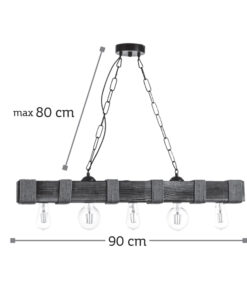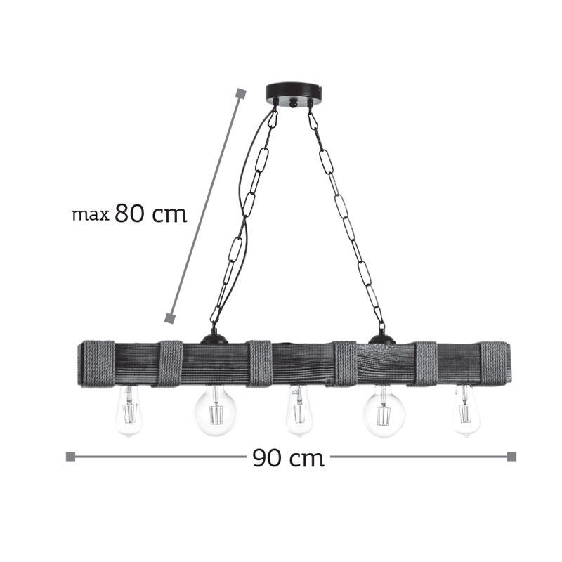 Πρόκειται για ένα κρεμαστό με πέντε λαμπτήρες που συνδυάζει αρμονικά το ξύλο και το σχοινί. Το προϊόν ολοκληρώνει η μαύρη αλυσίδα που του επιτρέπει να προσαρμόζεται ιδανικά στον κάθε χώρο.