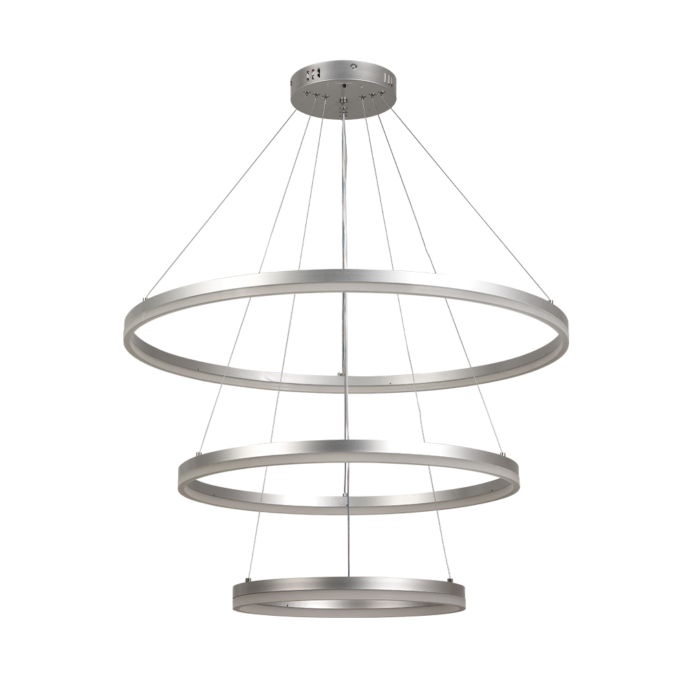 Κρεμαστό φωτιστικό LED 100W σε ασημί απόχρωση με επιλογή απόχρωσης φωτισμού απο διακόπτη που βρίσκεται στην β΄άση του φωτιστικού (3CCT by switch on base) .Το προϊόν παρέχεται με 2 επιλογές τοποθέτησης .Το προϊόν ντιμάρεται απο απλό διακόπτη τοίχου με εναλλαγή στο πάτημα (3 step dimmable)